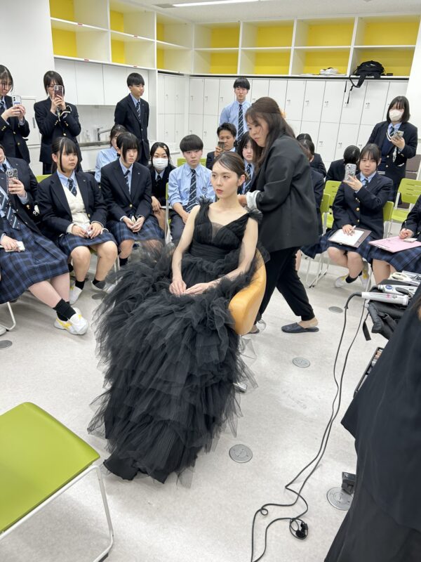 今回の授業は「ブライダルヘアメイク」をテーマに、トレンドのヘアスタイルやドレスについてライブ感にあふれたデモンストレーションをして戴きました。