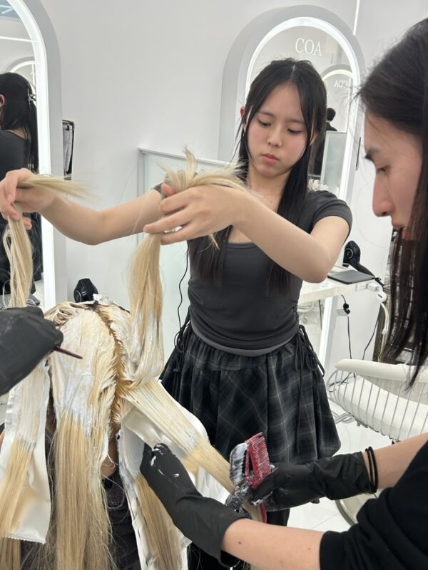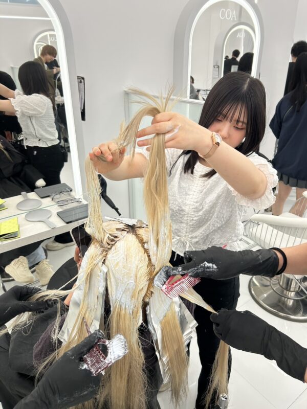 中には写真のように、サロンスタッフの方とともに、来店されたお客様のブリーチを担当した生徒もいて、本当のサロンスタッフのようです( *´艸`)