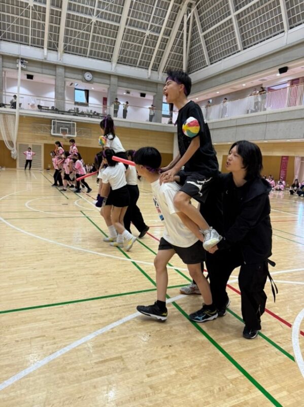 借り物競争、二人三脚、綱引き、騎馬戦、クラス対抗リレーの五種目を競い合いました。